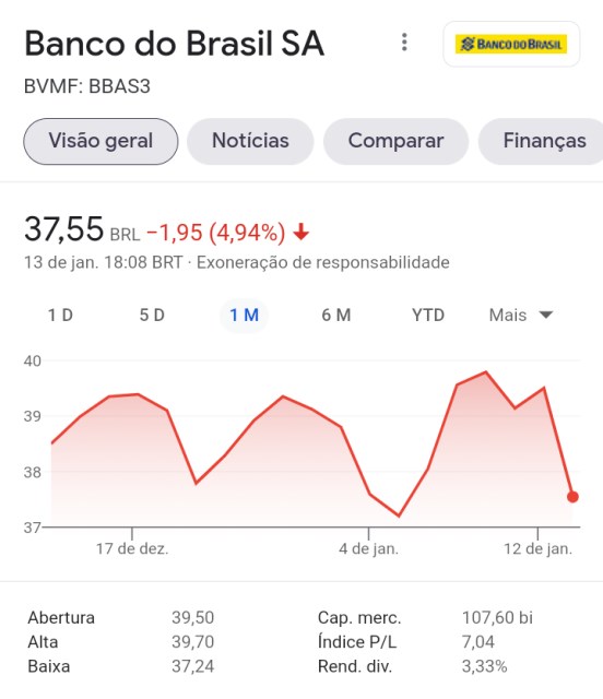 Exibir a cotação de ações de bbas3 mais recente e o gráfico do msn dinheiro. Stock quote, stock chart, quotes, analysis, advice, financials and news for share banco do brasil s.a. Banco do brasil s/a ord. (bbas3) cotação da empresa banco do brasil on com preços de ações, gráfico, forum, dividendos e balanços na bolsa de valores da bovespa. Gráficos, cotações, proventos, resultados, análises, notícias, fatos relevantes e mais. View the latest banco do brasil s/a ord (bbas3) stock price, news, historical charts, analyst ratings and financial information from wsj. Find the latest brasil on ej nm (bbas3.sa) stock quote, history, news and other vital information to help you with your stock trading and investing. Br:bbas3 / banco do brasil sa (p11427112). Dear investor, as almost the financial sector in brazil, bmfbovespa:bbas3 fell too much in this coronavirus crisis. Read the latest writing about bbas3. Bbas3 resultado 1t20 do banco do brasil 1º trimestre de 2020 do banco do brasil dividendos. Fundado em 12 de outubro de 1808, sua instalação aconteceu após a vinda da família real portuguesa para o brasil. Novo valor da corretagem de ações no bbas3 | bbas3 holder iniciante.