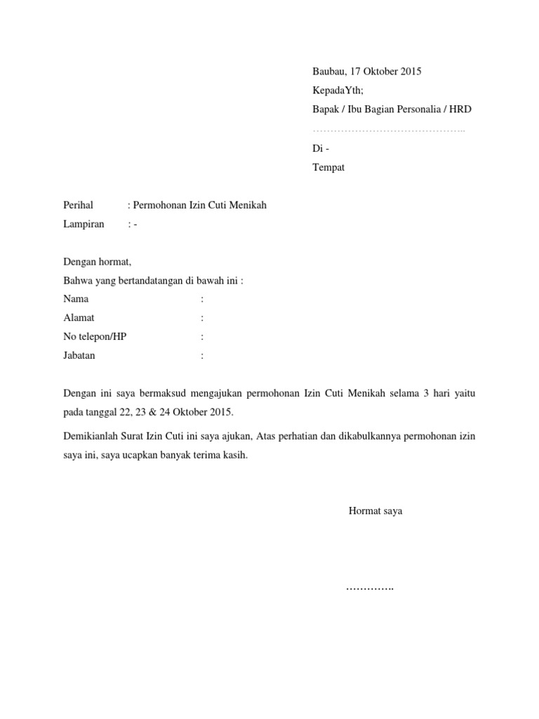 Surat izin orang tua (menikah). Cara membuat surat izin cuti menikah yang benar. Baik itu di kantor maupun di kua. Contoh surat izin adalah sebuah surat yang dibuat dengan tujuan untuk meminta izin kepada penerima bahwa sang pengirim memiliki hajat / acara tertentu sehingga tidak bisa hadir atau. 1.1 cara menulis surat izin betul dan baik 1.22 contoh surat izin tidak masuk kerja atau kuliah karena menikah